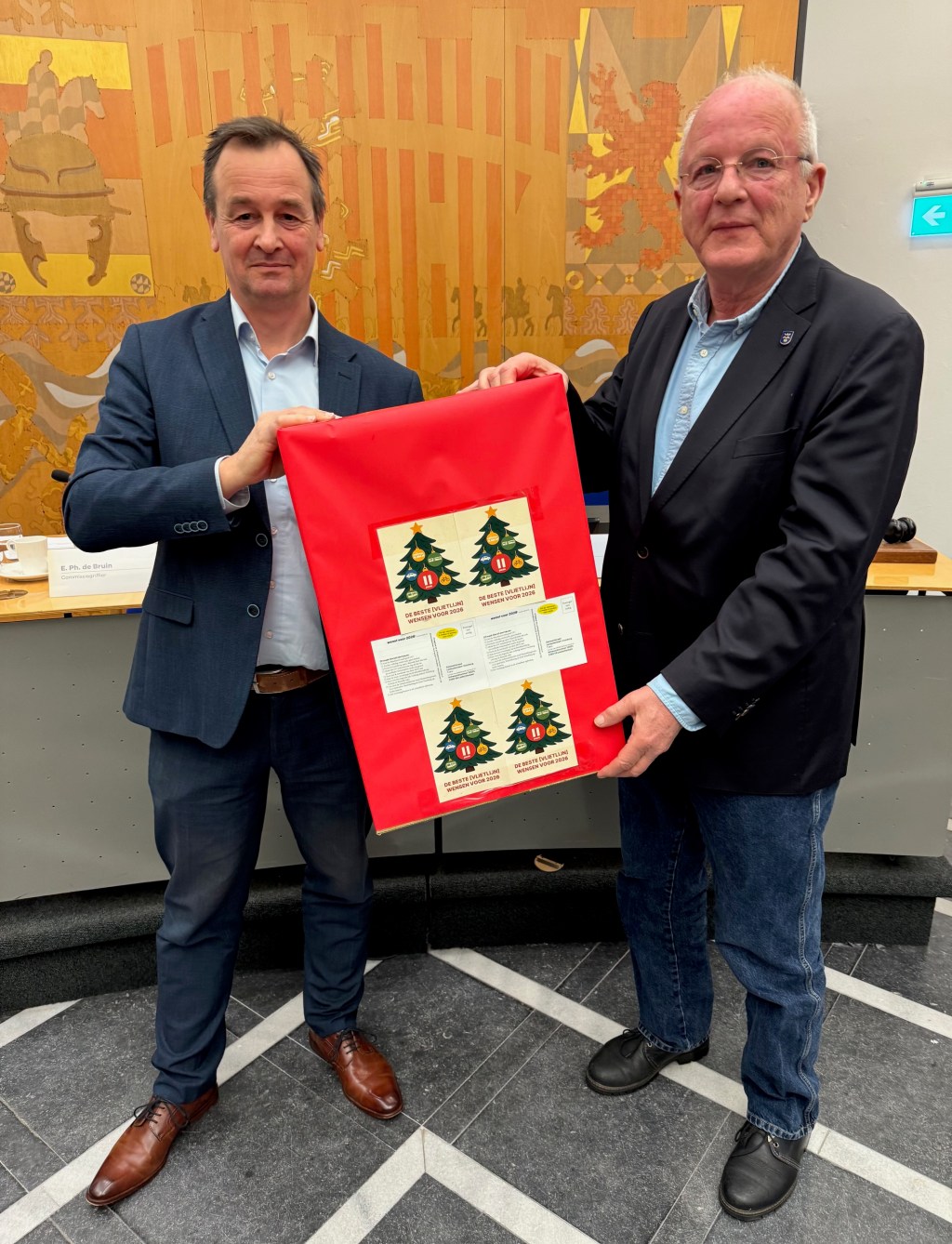 Leidschendam-Voorburg, 20 januari – Paul Oomens, inwoner van Voorburg-West, overhandigde symbolisch een doos met nieuwjaarswenskaarten aan de voorzitter van de commissie Omgeving. De kaarten maken deel uit van een nieuwjaarsactie waarbij inwoners hun wensen en aandachtspunten hebben gedeeld over de plannen rondom de Vlietlijn.